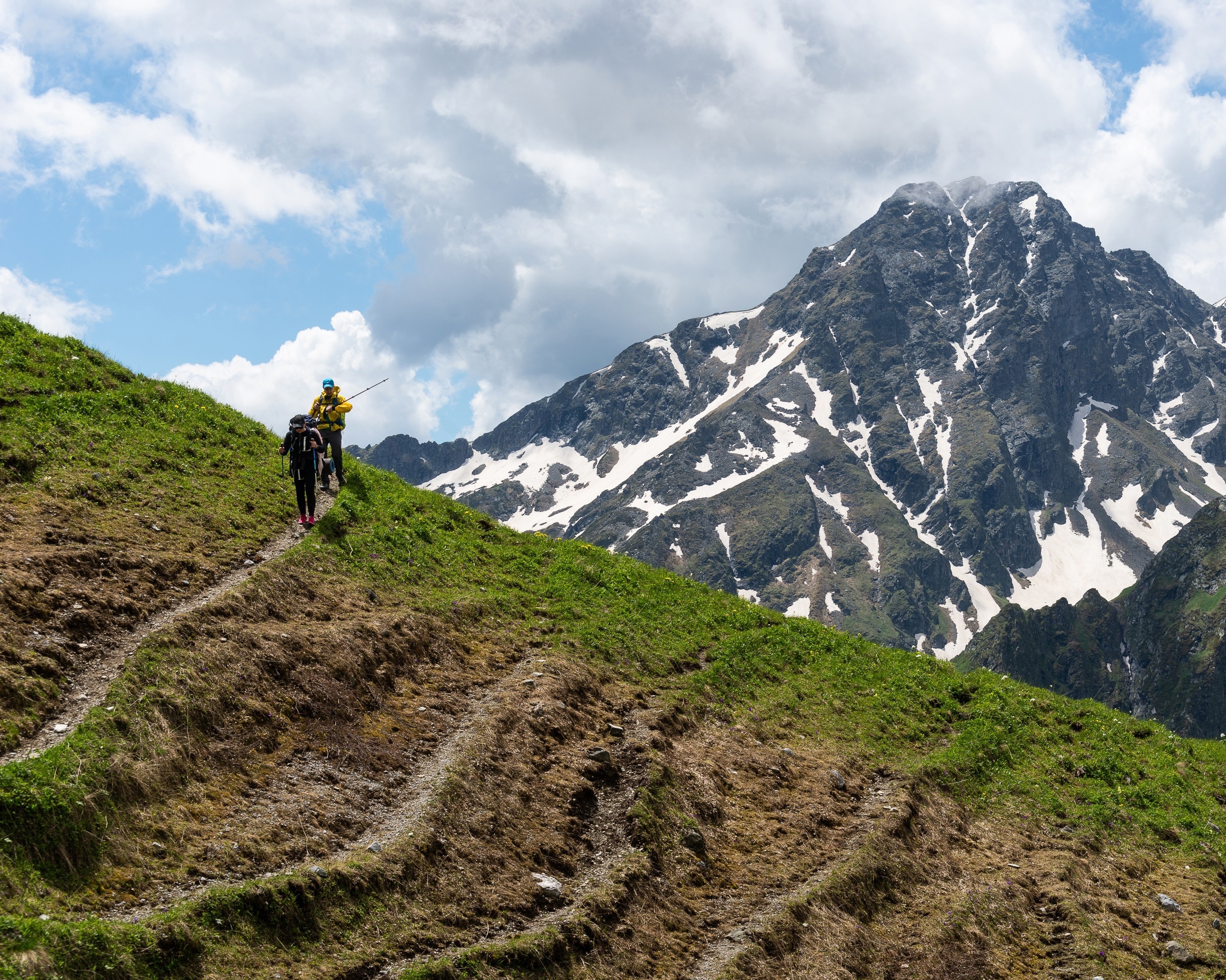 12 июня. Приезжаем в п. Курджиново, пересаживаемся в машину повышенной проходимости и забрасываемся под г.Дженту. Сегодня идём через Белую скалу, на перевал Блыбский к лагерю на луковой поляне в долину реки Бескес с кристальной водой. Там очень красивое место с видом на Дженту, Маркопидж, Магишо. Ставим лагерь, отдых, ужин.